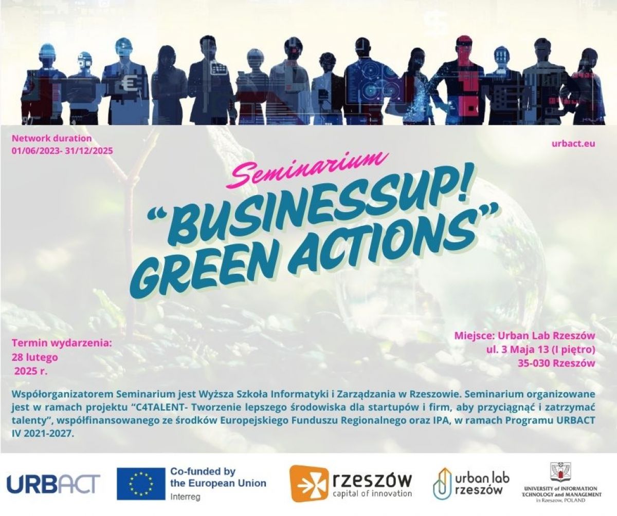 Celem Seminarium „BusinessUP! Green actions” jest m.in. edukacja w zakresie przedsiębiorczości w obszarze prezentacji pomysłu na biznes, jak również pobudzanie i rozwijanie aktywności biznesowej, zwłaszcza wśród studentów. Istotnym jest również zwrócenie uwagi na włączanie inicjatyw proekologicznych w działalność przyszłych firm.