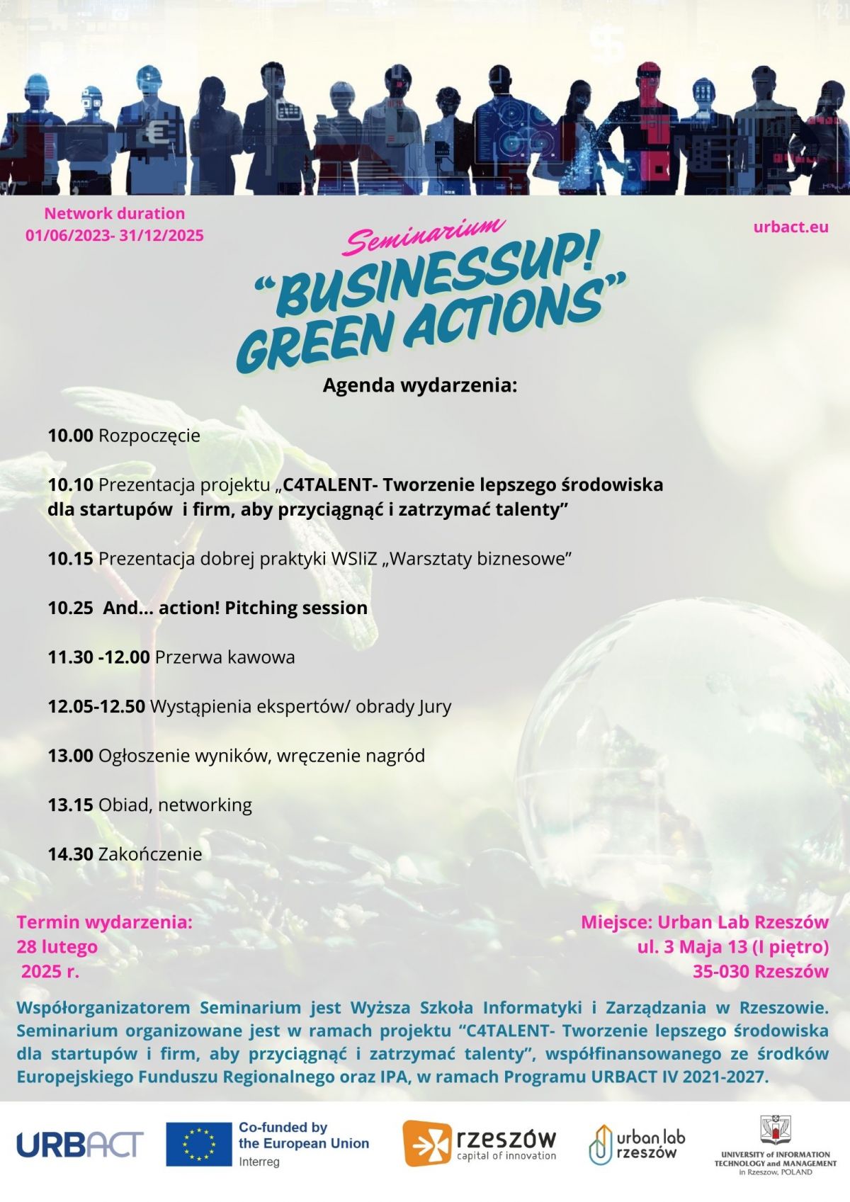 Podczas Seminarium swoje propozycje wystąpień przedstawi pięciu studentów Wyższej Szkoły Informatyki i Zarządzania w Rzeszowie, a ich pomysły oceniać będzie Jury, w którego skład wchodzą przedstawiciele lokalnego ekosystemu przedsiębiorczości, zgromadzeni w ramach Lokalnej Grupy URBACT, działającej przy projekcie „C4TALENT”.